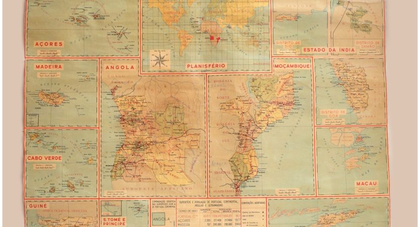 que a gente seguia através da caninha do professor a indicar os risquinhos no mapa pendurado na parede – Portugal Continental, as Ilhas Adjacentes e as Províncias Ultramarinas – com o Alto Alentejo a rosa-choque e a Beira Alta a azul-pervinca, a caninha a desviar-se de quando em vez do mapa e da parede para mergulhar com um silvo tenebroso