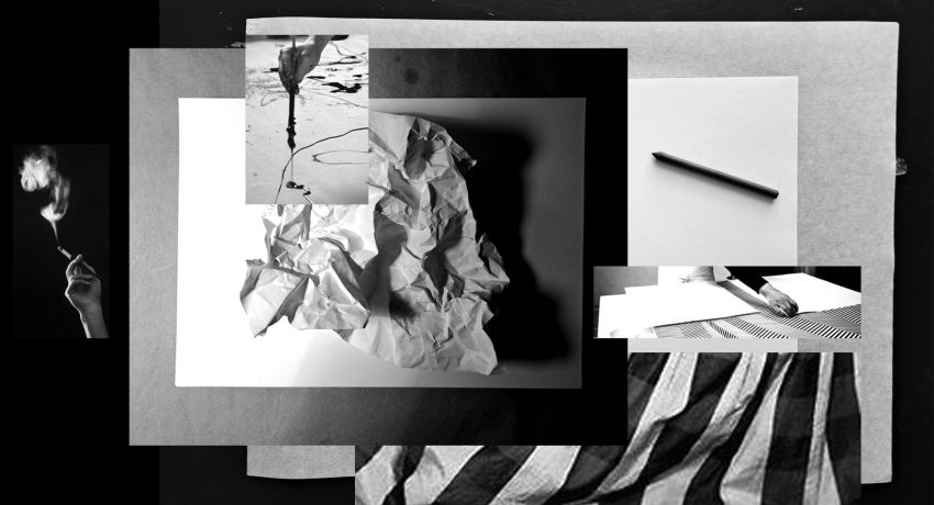 O espetáculo de Cão Solteiro e Vasco Araújo parece ser em alguns momentos a representação desse fazer de Sísifo, como aponta Maria S. Mendes num outro texto entregue pela companhia, neste caso como parte de um caderno que se recebe à entrada: um “trabalho que cheg[a] para a eternidade”. Em palco, uma pessoa empilha copos para construir uma pirâmide que, de tanto crescer, acaba por ceder e desfazer-se em cacos; uma outra experimenta, com projetores e computadores, os efeitos da projeção no teatro de imagens abstratas ou memes; e ainda outra, o artista Vasco Araújo, desenha linhas sobre uma enorme superfície de papel de cenário estendido no centro do palco. Depois de marcar o papel com alguns traços de tinta, o artista acaba por levantar o papel e amarrotá-lo para o amontoar numa pilha de papel gigantesca que se vai formando como um monstro de trabalho inconsequente. Feito isto, recomeça a tarefa com um outro papel. Estamos a assistir ao trabalho de artistas, numa representação que corresponde a um conjunto de ideias familiares que dele temos: lento, falhado, inconsequente, lúdico e infinito. E o passar do tempo vai-se marcando por mudanças de roupa (os figurinos de Mariana Sá Nogueira), quase impercetíveis, porque repetindo os mesmos tons: pretos e brancos ordenados em diferentes padrões. Acrescenta-se um casaco, um chapéu, troca-se de camisola, mas o preto e o branco nunca desaparecem.